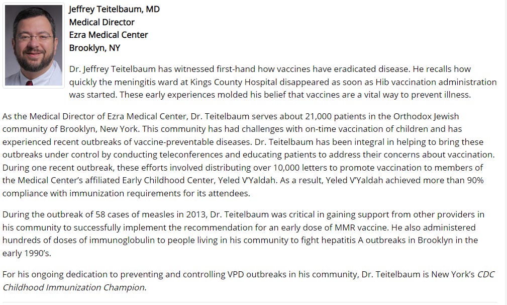 Malky Rosin works for an organization called Yeled V’Yalda, an Early Childhood Center but also an affiliate with Ezra Medical Center. As mentioned in the video, Yeled V’Yalda is serviced by the medical director of Ezra, Dr. Jeffrey Teitelbaum. It may be interesting to note that Dr. Teitelbaum was awarded immunization champion in 2015.